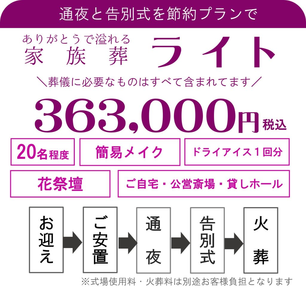 家族葬 ライトプラン(363,000円) 家族葬 スタンダードプラン(462,000円) 家族友人葬 ライトプラン(467,500円) 家族友人葬 スタンダードプラン(605,000円) 公営斎場をおすすめします