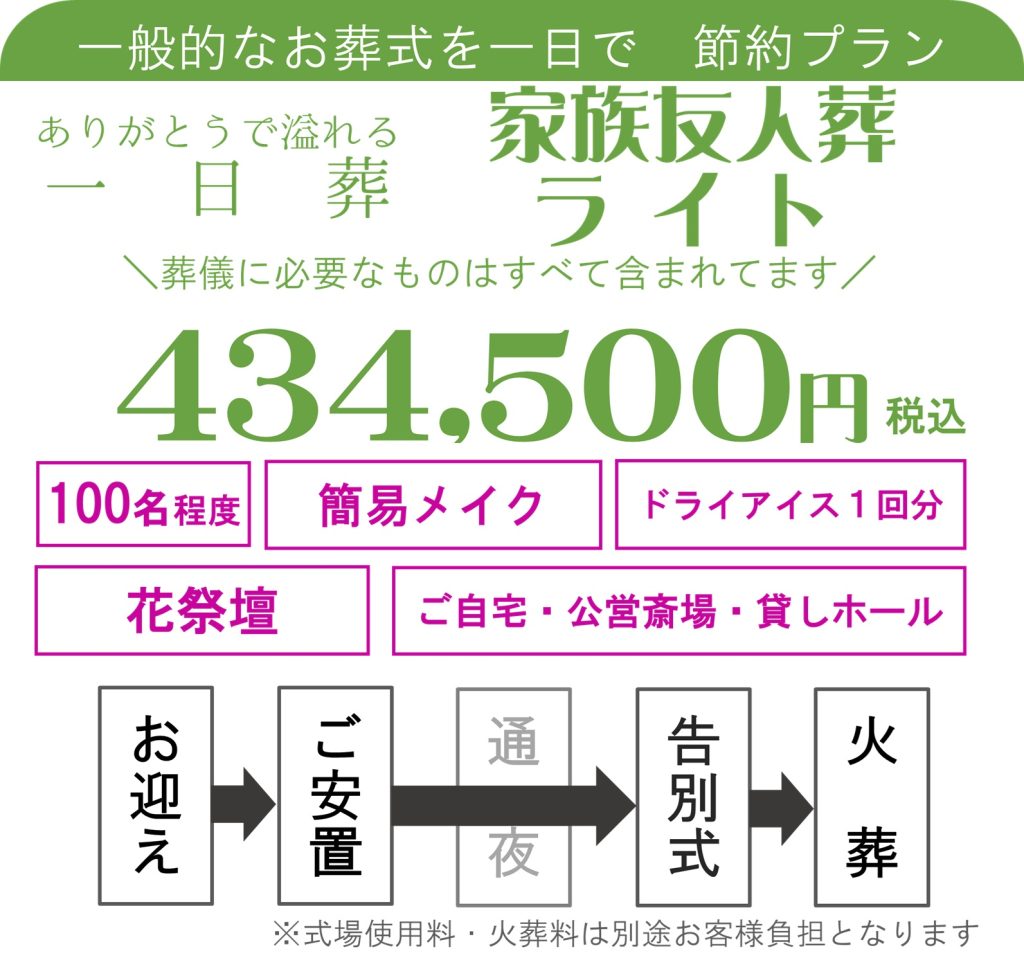 お別れ葬プラン(275,000円) 家族一日葬 ライトプラン(330,000円) 家族一日葬 スタンダードプラン(429,000円) 家族友人葬 ライトワンデー(434,500円) → 通夜と告別式を行う